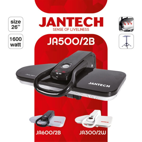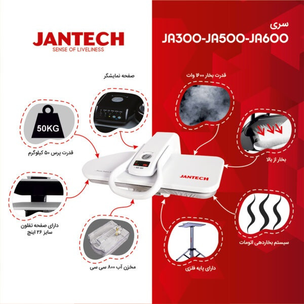 اتو پرس جانتک مدل JA600، JA500 , JA300 دارای مشخصات فنی یکسانی میباشند و تفاوت آنها در رنگ دستگاه میباشد.
