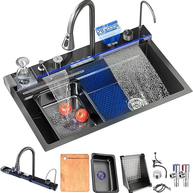 فول آپشن ترین سینک پیانویی رنگ سینک دودی مشکی ،5 کلید شامل لیوان شور اتوماتیک ، شیر تسویه آب اتوماتیک ، 2 آبشار ، جامایع ، دیمر درجه آب ، نمایشگر دیجیتالی ، تخته چوبی ، 2 عدد سبد استیل. تمیز کردن و نگهداری آسان سطح نانو ، ارسال ایمن سراسر کشور ، با نمایشگر دیجیتال ، ابعاد سینک آبشاری بارانی 46x75 ، استنلس استیل مشکی 304 ، کلید پیانویی جهت بازو بسته کردن شیرها